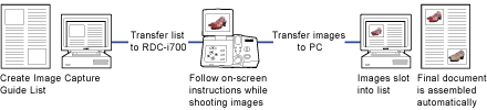 Here's a handy feature that can help you take on the biggest jobs with ease. Using one of the sample template files in Microsoft Word or Excel included on the Software CD supplied, build an Image Capture Guide List and transfer it to the RDC-i700. As you shoot the images according to your list, the camera keeps track of each one. Then, when your images are transferred to your computer, they link up again with the source file. Your final document builds itself, automatically.(Windows only)